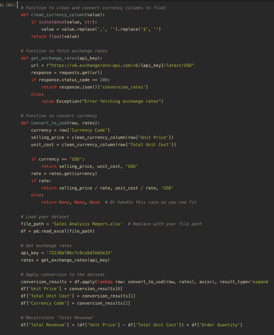 To handle the diverse currencies, a real-time currency conversion API was employed. This tool provided the most current exchange rates, ensuring that all financial data reflected up-to-date economic conditions. This step was crucial for maintaining the integrity and relevance of the financial analysis.
